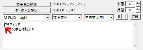 テキストを標準文字から影付き文字や縁取り文字に変更している場合、<#ffffff,008cbd>のように文字色の後にカンマで区切って影や縁取りの色を指定することができます。