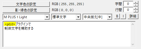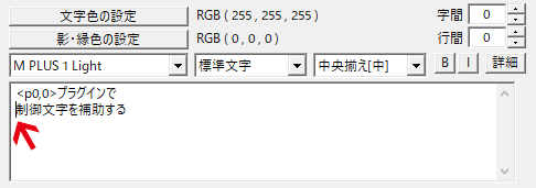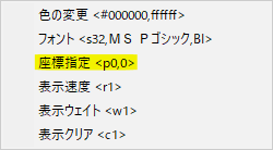 <p0,0>の制御文字が挿入され、座標指定ができます。そのままの状態でテキストを左揃えにすることができますね。