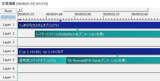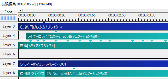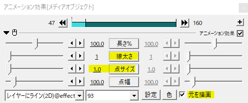 レイヤーにライン(2D)をメディアオブジェクトとして出した理由は中間点にあります。くっきり円とは別オブジェクトにすることでパラメータの移動を重ねることができます。