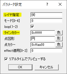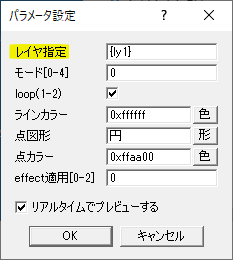 パラメータ設定のレイヤ指定でテキストオブジェクトを置いたレイヤーを指定します。
