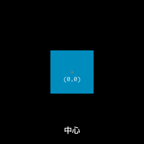 サイズ150の四角形(図形)です。通常、オブジェクトの中心は領域の中央(0,0)に据えられています。