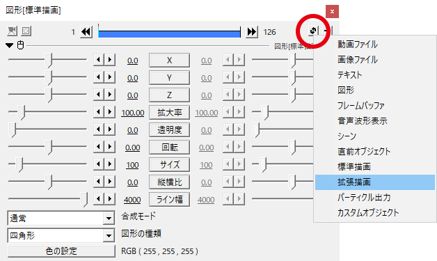 オブジェクトの中心を表示させるために、オブジェクトを標準描画から拡張描画へと変更します。