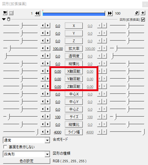回転にはXYZ軸回転があります。中心と同じように、オブジェクトを拡張描画にすると設定項目が表示されます。