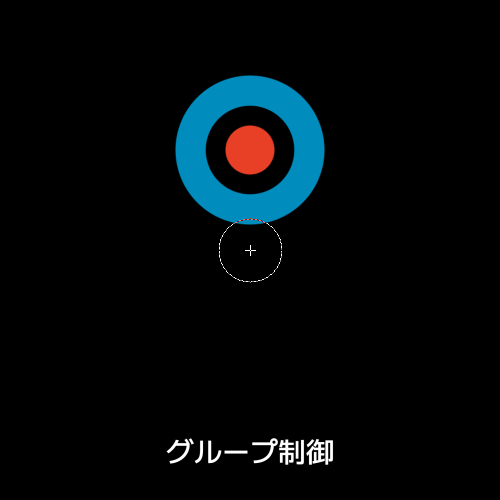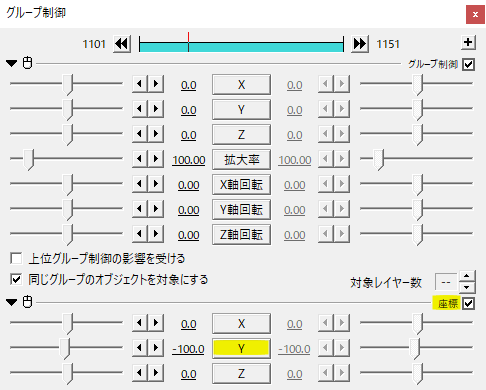 グループ制御に基本効果の座標をかけ、XYZで中心位置をずらすことができます。