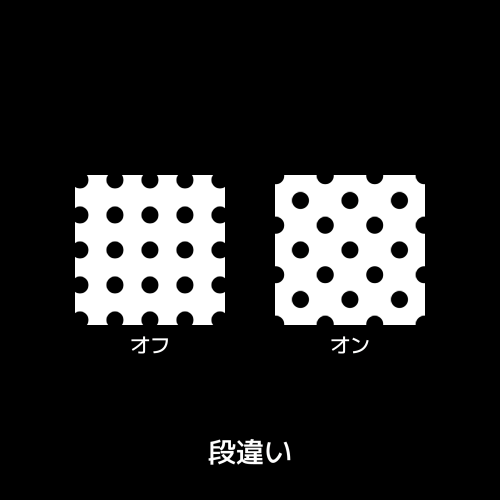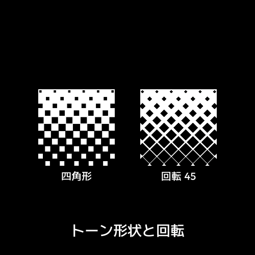 一方、黒色にした四角形にハーフトーンT改をかけると、トーン大で点の大きさを調節することができます。こちらもトーン小を動かしても変化はありません。