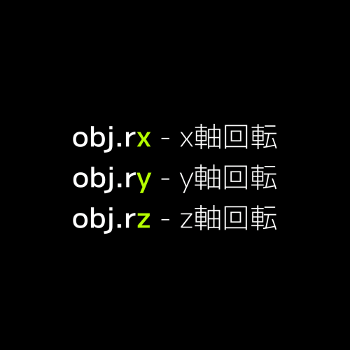 スクリプト制御で扱う回転は3種類、xyz軸回転です。標準描画で普段から使っているのはz軸回転ですね。とりあえず、この三つを覚えておきます。