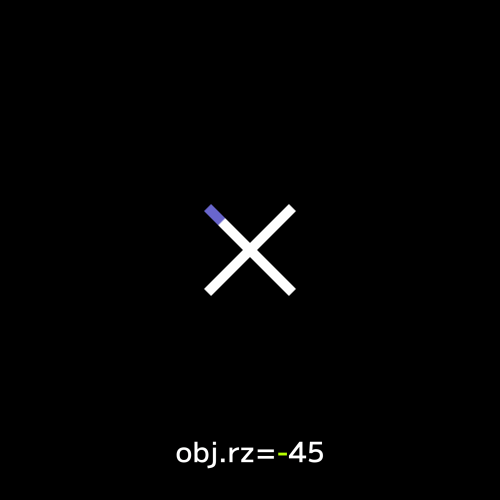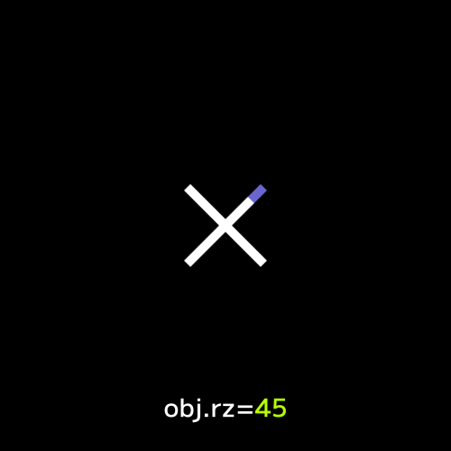 obj.rzはz軸回転でしたね。obj.rzの値として45を入れるとz軸方向にオブジェクトが45度回転します。