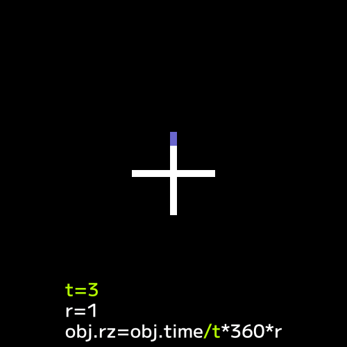 obj.time/tとすることでt秒で1になるようにします。つまりt秒で1回転ですね。ここではtに3を入れたので、3秒で1回転とゆっくり回ることになります。