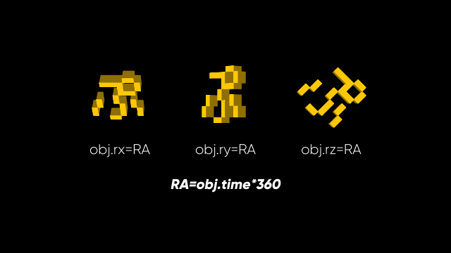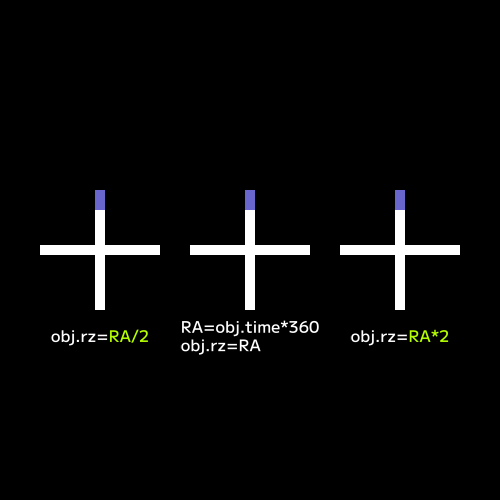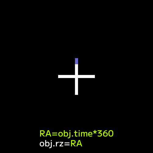 そこでRAでオブジェクトが1秒間に1回転すると定義すれば、他のオブジェクトにはobj.rz=RAとするだけで済みます。