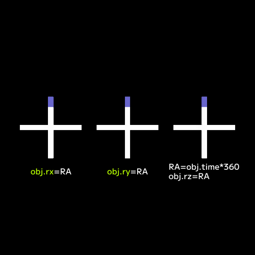 他のオブジェクトと連動させることを前提とする場合です。任意の文字列RAにobj.time*360を入れてobj.rz=RAとしました。