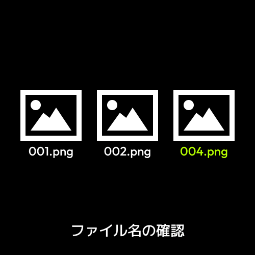 まずはファイルの名前ですね。欠け番があったり、002の次が03だったり、連番が止まっているあたりのファイル名を確認してみてください。