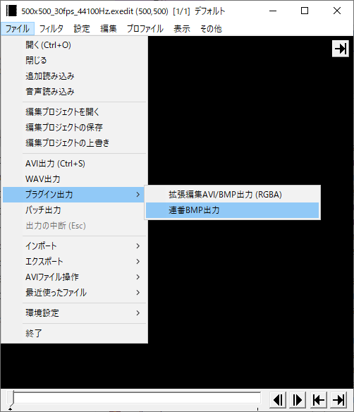 出力する際は、プラグイン出力から連番BMP出力を選択します。
