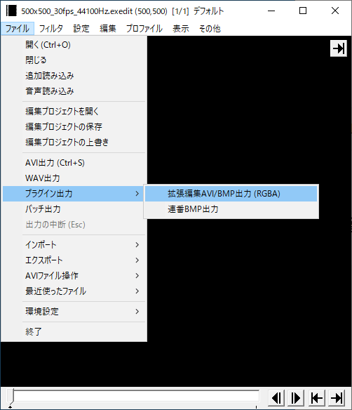 AviUtlで編集した画像を背景透過で連番出力したい場合は、同じくプラグイン出力から拡張編集AVI/BMP出力(RGBA)をクリック。