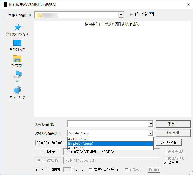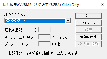 ファイルの種類でBmpFile(*.bmp)を選択します。一応、ビデオ圧縮から圧縮プログラムでアルファチャンネルが付いているか確認しておきます。