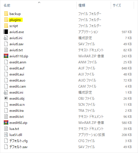 ファイルを解凍し、bmp_output.auoをpluginsフォルダに入れて導入は完了です。
