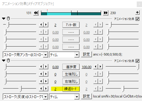 繰返モード2は先頭のオブジェクトに連なるようにオブジェクト自体が移動する動きになります。