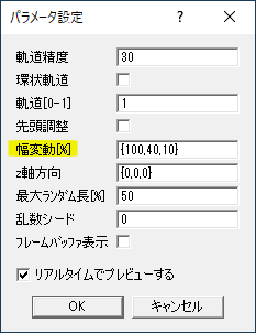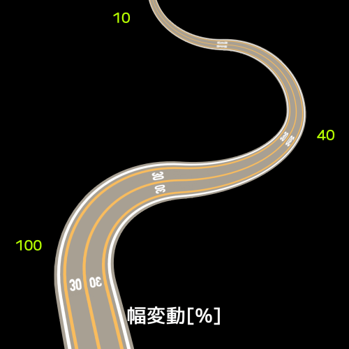 幅変動[%]の項目でオブジェクトの幅を調節することができます。例のように{100,40,10}とすると、始点では100%、中間で40%、終点で10%となります。