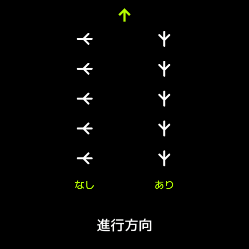 そのままだと左側のように右を向いた素材が縦に描画されますが、パラメータ設定の進行方向にチェックを入れるとアンカーから次のアンカーに向かってオブジェクトが進行方向を向くようになります。