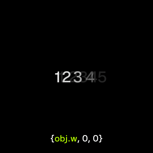 {obj.w, 0, 0}とすることで、文字の幅の分だけ横にずれます。