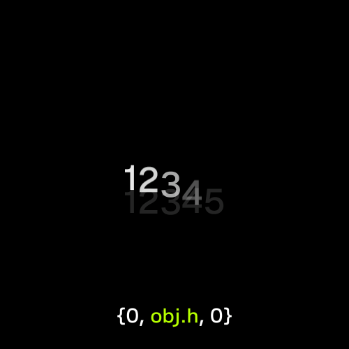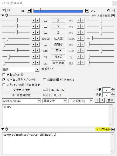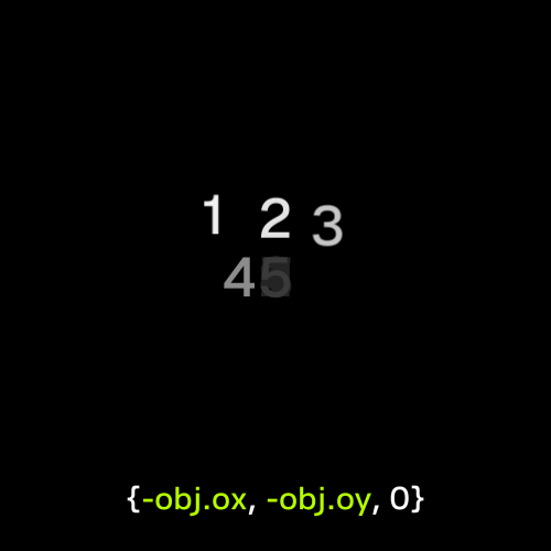 {obj.ox, obj.oy, 0}とすることで外側から内側に向かって移動するテキストアニメーションになります。