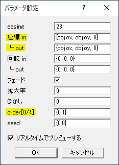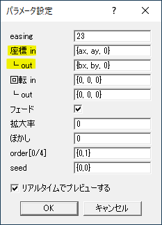 パラメータ設定の座標 in{x座標,y座標,z座標}で登場位置を、同様に座標 out{x座標,y座標,z座標}で退場位置を設定します。