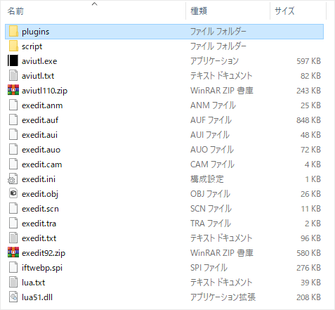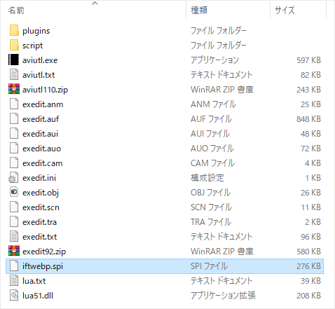 解凍したファイルの中から、iftwebp.spiというファイルをAviUtlのexedit.aufと同じ階層に置きます。