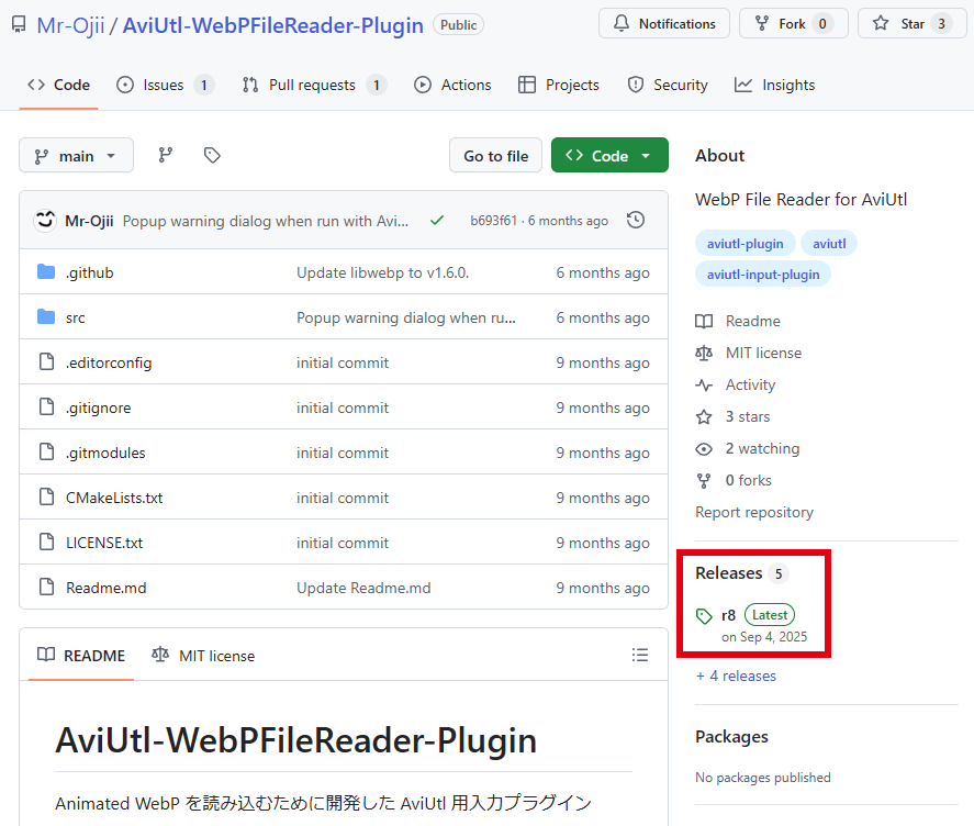 Mr-OjiiさんのページからAviUtl-WebPFileReader-Pluginを入手します。右側にあるReleasesから最新のバージョンをダウンロードします。
