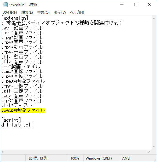 exedit.iniをメモ帳等で開き.webpを関連付けます。