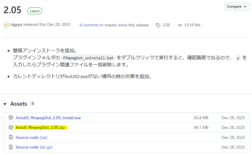 AviUtlでWebP出力をするためにrigayaさんのffmpegOutを利用します。Releasesから最新版をダウンロードします。