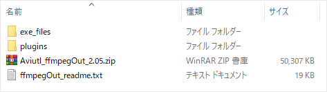 Aviutl_ffmpegOut_x.xx.zipをダウンロードし、解凍します。解凍した中身をすべてAviUtlフォルダにコピーすれば導入完了です。