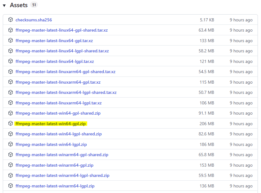 いっぱいありますが、ffmpeg-master-latest-win64-gpl.zipをダウンロードします。