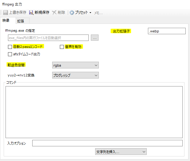 ffmpeg出力ではコマンドを指定することでカスタマイズできます。
